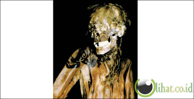 [lihat.co.id] - Mumi yang satu ini dikenal dengan sebutan 'Putri Altai', diperkirakan telah ada sejak 2.500 tahun lalu di kawasan Siberia. Mumi yang ditemukan pada 1993 ini memiliki keunikan tersendiri, di bagian lengannya ditemukan sebuah tato dengan motif menyerupai rusa, bahkan motif tersebut ditemukan pula di bagian petinya.