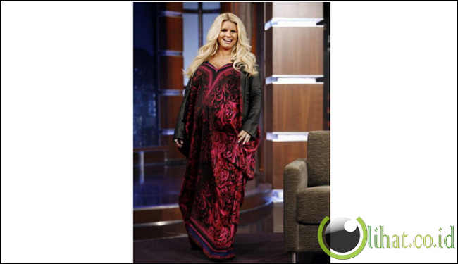 [lihat.co.id] - Mungkin ini adalah salah satu gaun paling buruk yang dipakai oleh Jessica Simpson. Hamil besar, Jessica mungkin ingin tampil nyaman dengan baju longgar, Namun dalam balutan gaun ini, Jessica seperti tenggelam dalam kain super lebar dan tanpa model sama sekali. Mirip daster ibu-ibu di Indonesia yang berbentuk kelelawar ya?