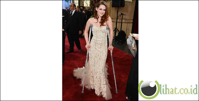 [lihat.co.id] - Ajang Oscar 2013 dikejutkan dengan penampilan Kristen Stewart yang hadir dengan kruk. Dengan langkah tertatih-tatih, dia berusaha tetap tampil sempurna di depan umum. Luka di kakinya itu diakibatkan oleh kecerobohannya saat berjalan sehingga menginjak kaca. Meski terluka, dia tetap cantik dengan gaunnya itu, kan? :)