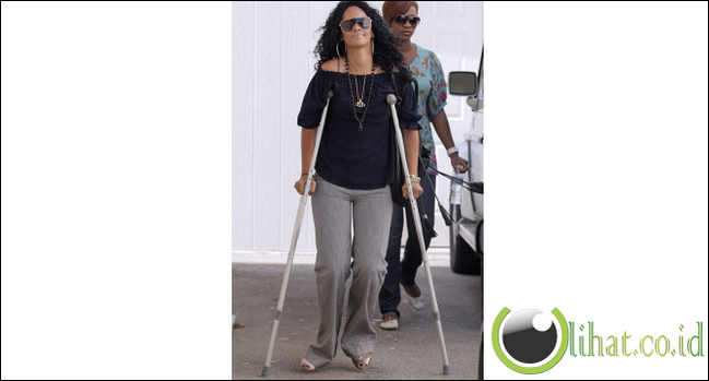 [lihat.co.id] - Beginilah penampilan Rihanna saat mengalami cedera kaki pada tahun 2008 akibat kecelakaan saat liburan saat itu. Walau terpaksa menghabiskan hari-hari di atas kruk, namun dia tetap memasang senyum tegar di depan umum.