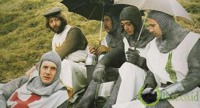 [lihat.co.id] - Para aktor yang bermain dalam MONTY PYTHON AND THE HOLY GRAIL seperti Terry Gilliam, Graham Chapman, John Cleese, dan Eric Idle khusus mengenakan kostum ala ksatria abad pertengahan untuk mendukung cerita tentang pencarian cawan suci.
