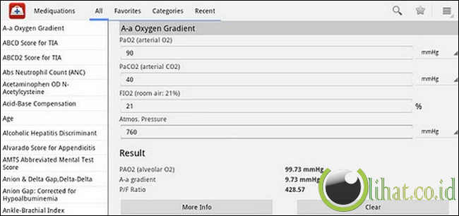 [lihat.co.id] - Mediquation hanyalah kalkulator medis terbaik di luar sana. Aplikasi ini dibayar dilengkapi dengan lebih dari 232 formula dan alat penilaian. Mediquations juga memberikan referensi, full equations, PubMed links dan banyak lagi. Aplikasi berjalan sempurna pada Android Ice Cream Sandwich. Mediquation juga terpilih sebagai “Staff Favorite” di iTunes Apps Store. Sedangkan di Google Play Store mendapatkan rating 4.4. Meski berbayar, anda tidak akan menyesal membeli aplikasi yang satu ini.