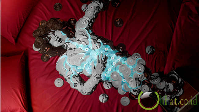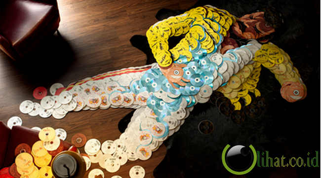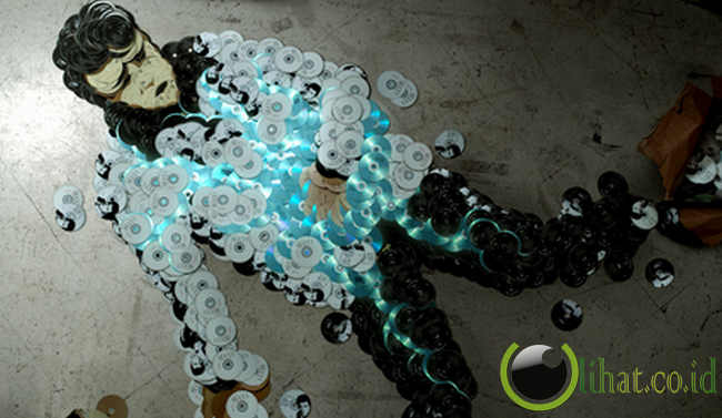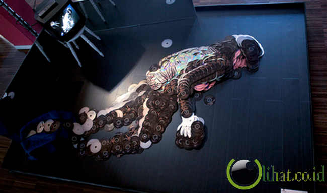 Seperti yang dilakukan oleh seniman Mirco Pagano, 29, dan Moreno De Turco, 25, ini. Mereka membuat karya seni berupa replika tubuh para bintang rock besar dengan media keping CD. Membutuhkan waktu 200 jam, mereka berdua menggunakan CD milik musisi itu sendiri untuk membuat replikanya.