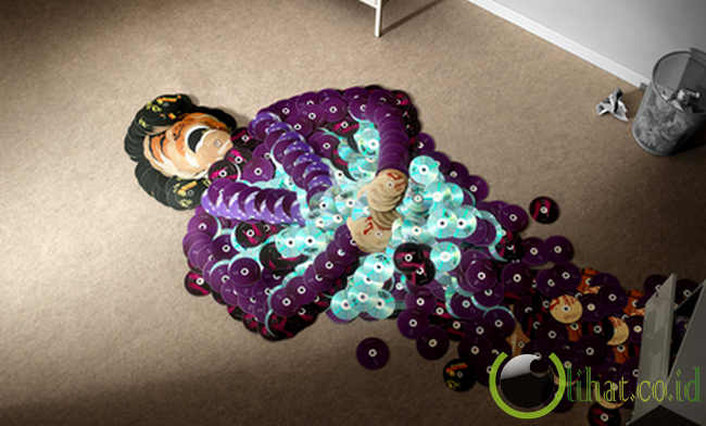 [lihat.co.id] - Selanjutnya adalah dewanya para pecinta reggae. Ya, opa Bob Marley. Saking luar biasanya seniman ini, mereka juga bisa menggambarkan rambut gimbal milik Bob Marley meskipun hanya dari tumpukan CD.