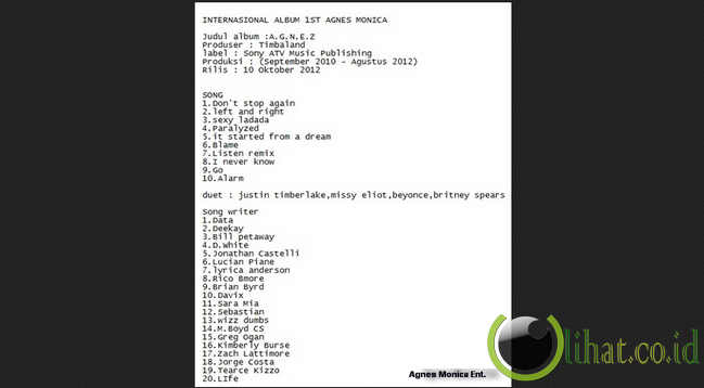 [lihat.co.id] - Bulan Mei 2012, fans di Indonesia dikejutkan dengan kabar rancangan komposisi debut album internasional Agnes. Sebuah akun Twitter bernama Anasismyname merilis komposisi album tersebut, lengkap dengan judul lagu dan musisi bintang tamu.